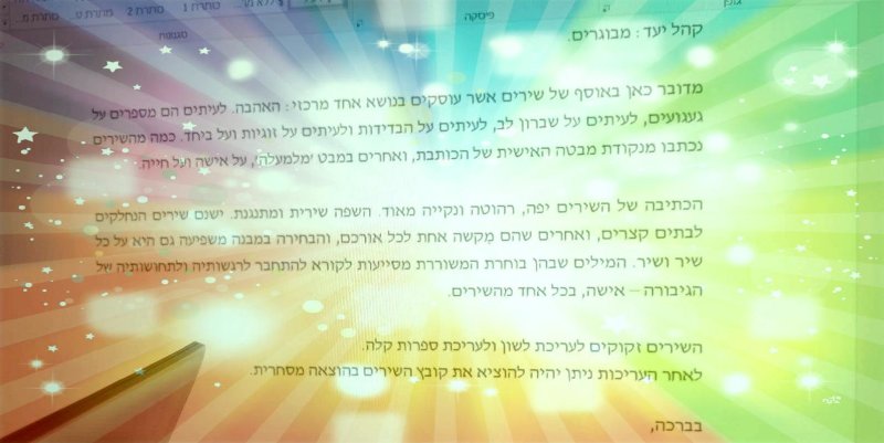 הַשְּׁתִיקוֹת שֶׁלְּךָ / וֶרֶד גִּילִינְסְקִי אַתָּה שׁוֹתֵק, מַבִּיט בִּי מֵהַמָּסָךְ וְשׁוֹתֵק. הַשְּׁתִיקוֹת שֶׁלְּךָ רוֹעֲמוֹת וּמְשַׁתְּקוֹת. אֲנִי רוֹצָה לִשְׁמֹעַ אוֹתְךָ, אֶת קוֹלְךָ. דַּעְתְּךָ, מִילוֹתַיִךְ חֲשׁוּבוֹת לִי וְאַתָּה שׁוֹתֵק, צוֹבֵט בְּלֵב, הַלֵּב צוֹעֵק, לֹא אוֹמֵר מִלָּה, פָּשׁוּט מַבִּיט וְשׁוֹתֵק. שׁוֹאֶלֶת שְׁאֵלוֹת וְאֵין תְּשׁוּבוֹת. שְׁאֵלוֹת נִשְׁאָרוֹת שְׁאֵלוֹת, לְלֹא תְּשׁוּבוֹת. אֲנִי מִתְנוֹעַעַת בְּחֹסֶר שֶׁקֶט. מִסְתַּכֶּלֶת בּוֹהָה בַּמָּסָךְ אוּלַי תָּבוֹא […]